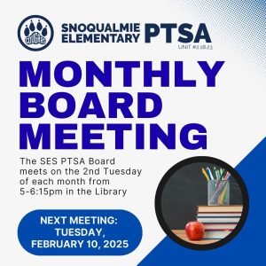 Snoqualmie Elementary PTSA, SES PTSA, ongoing mission is to support all students at Snoqualmie Elementary by supporting programs, assisting school staff, and promoting family involvement.