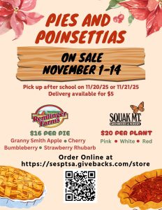 ‘Tis the season for pies and poinsettias and we’re providing both! Grab a delicious Remlinger Pie for $16 each and a stunning Squak Mountain poinsettia for $20 each. Pies are available in four flavors (Granny Smith, Strawberry Rhubarb, Bumbleberry or Cherry) and poinsettias are offered in three colors (white, red or pink). Order now through November 14 and pick-up after school on November 20 or 21 – just in time for Thanksgiving! Pies and poinsettias make great gifts too!