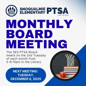 Snoqualmie Elementary PTSA, SES PTSA, ongoing mission is to support all students at Snoqualmie Elementary by supporting programs, assisting school staff, and promoting family involvement.